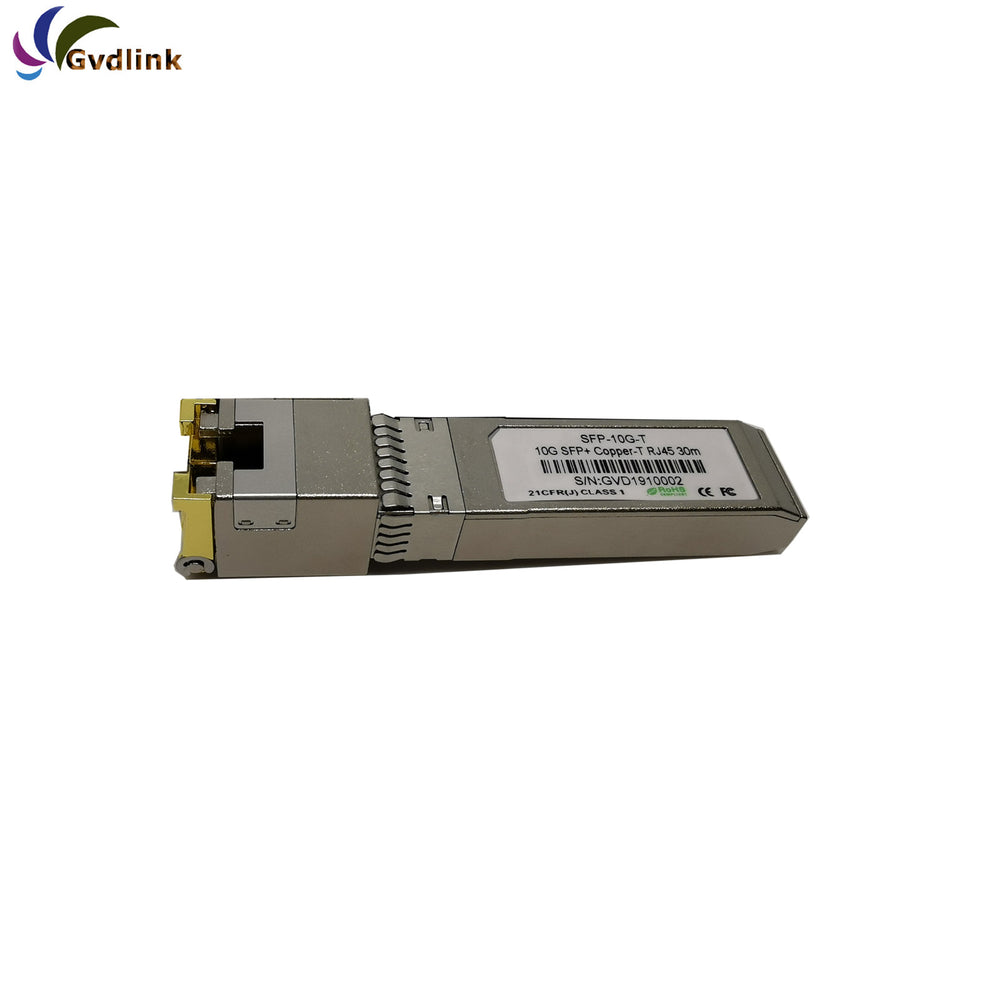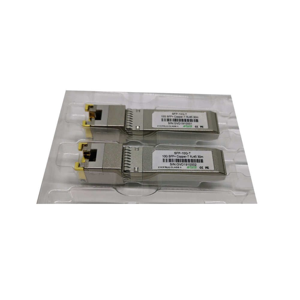 The 10GBASE-T module offers connectivity options at 10Gbps data rates. The module features an SFP+ form factor and an RJ-45 interface, enabling the use of CAT6A/CAT7 cables for connecting to endpoints with embedded 10GBASE-T ports. It supports distances of up to 30 meters, providing a cost-effective solution for intra-rack and inter-rack connections.